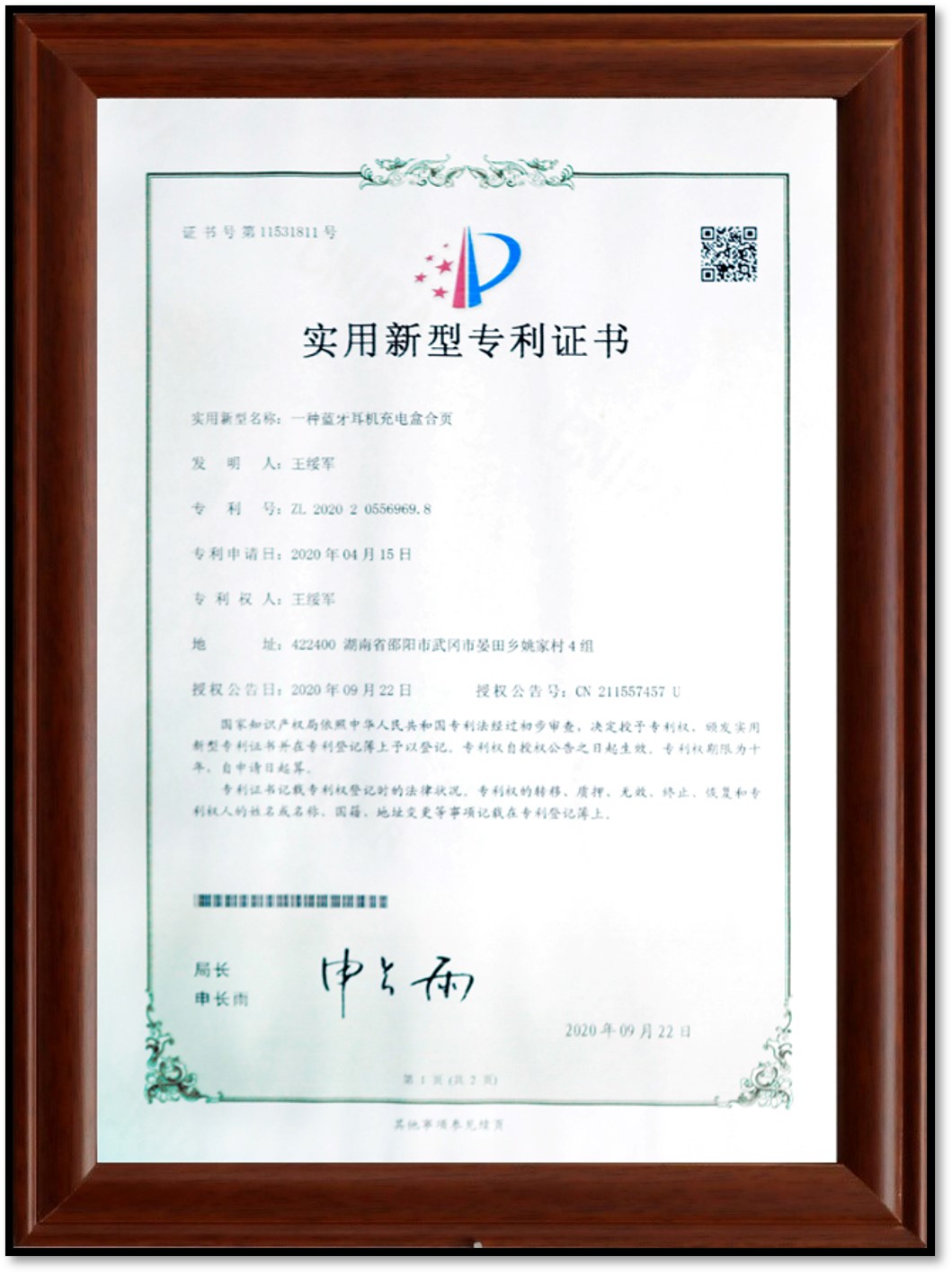 • 實用新型專利證書